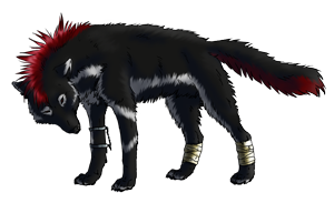 Whyko ist ein schwarzer Rüde mit weißen Markings auf dem Fell. Auch er trägt eine kurze rote Mähne die auf seiner Stirn nach vorn fällt. An seinem linken Vorderlauf befinden sich ebenfalls zwei Armringe, die mit einer Eisenkette verbunden sind. Seine Augen sind rot. Seine Körperstatur ist zwar kräftig aber doch etwas kleiner als die seines Bruders
